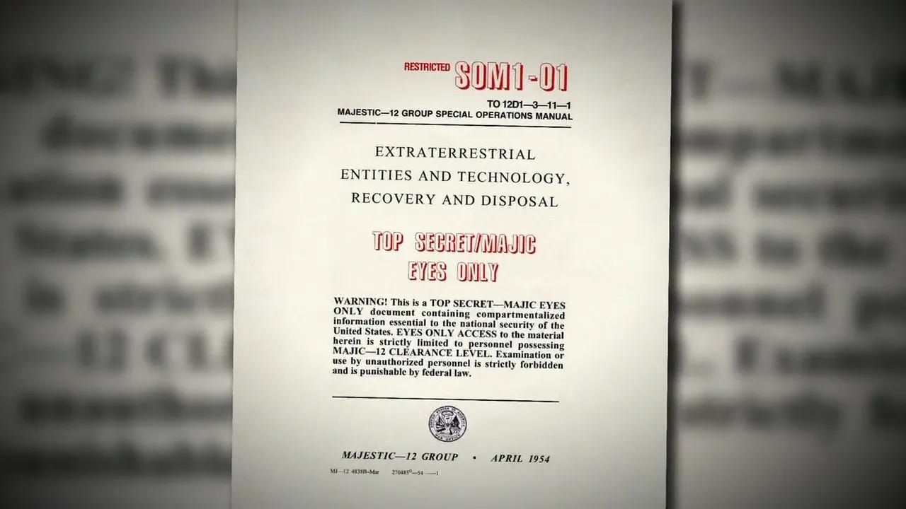 Según el documento SOM1-01, el MJ-12 «considera que todo el tema [de los ovnis y los extraterrestres] es una cuestión de máxima seguridad nacional. Por ese motivo, todo lo relacionado con el tema ha recibido la máxima clasificación de seguridad». Entre los objetivos del grupo se enumeran: la recuperación y el estudio de materiales, dispositivos, entidades y restos extraterrestres «por todos los medios que se consideren necesarios» y en cualquier lugar del planeta; el establecimiento y la administración de «equipos especiales», instalaciones especiales seguras, operaciones encubiertas (en colaboración con la CIA) y «secreto absoluto» para lograrlo. La razón de este nivel de secreto «tiene que ver con las consecuencias que pueden derivarse no solo del impacto que tendría en la opinión pública el hecho de que la existencia de tales asuntos se convirtiera en conocimiento general, sino también del peligro de que una tecnología tan avanzada como la recuperada por la Fuerza Aérea cayera en manos de potencias extranjeras hostiles».