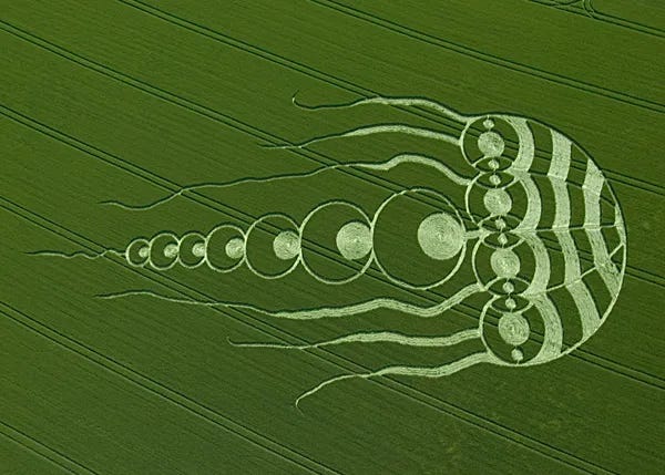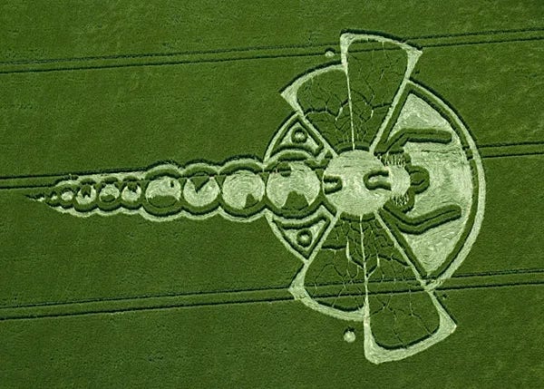 Este colibrí apareció durante un período de mayor actividad de círculos de las cosechas en Gran Bretaña, uno con varias figuras de animales, incluyendo una medusa el 29 de mayo y una libélula el 3 de junio.